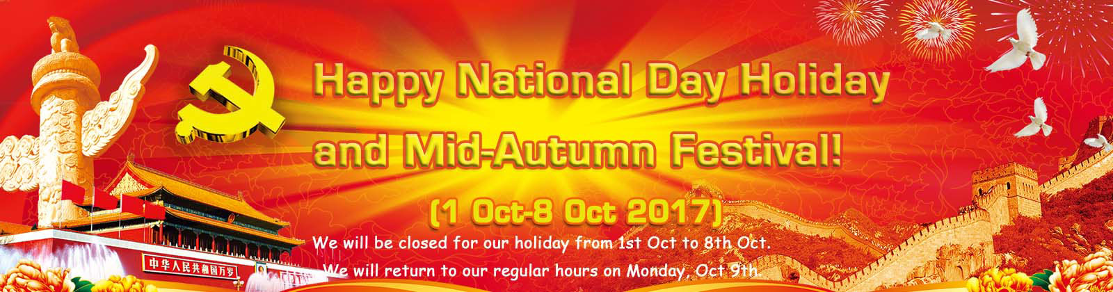 Because of the National Day and Mid-Autumn Day holiday, we will be on holiday from 1st Oct to 8th Oct. The last day for delivering goods is Sep 30th, we sincerely remind you to check your stock and order before Sep 30th, that your goods can be delivered before our holiday.
