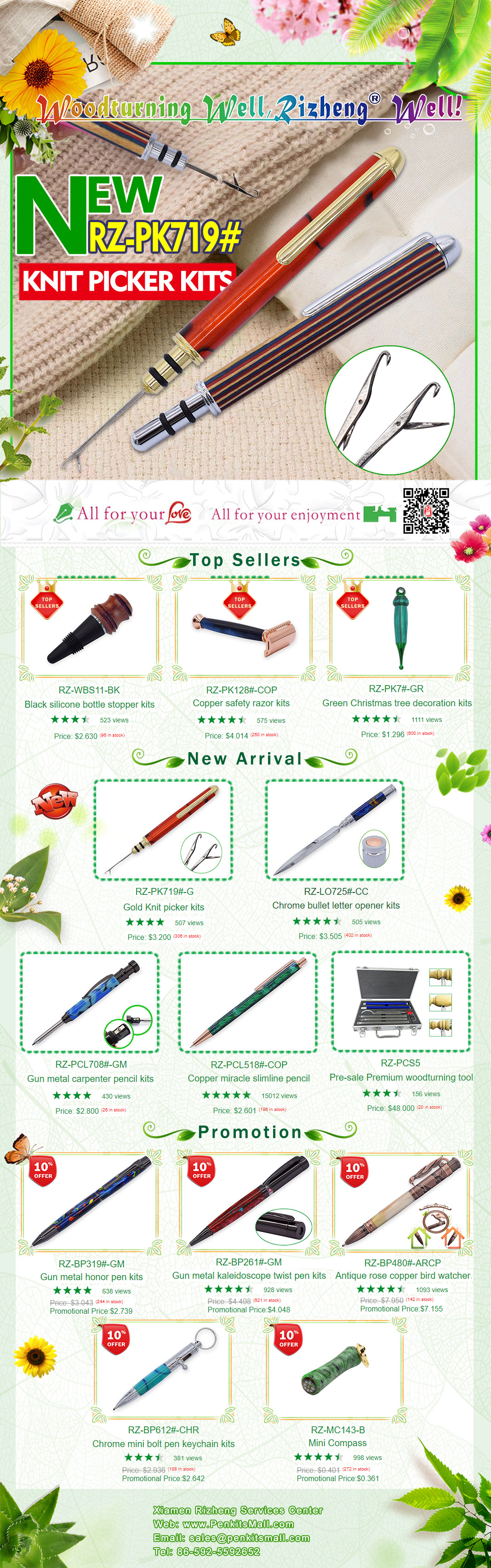 PS: New product referral rewards in action now! If you have any idea (we can design for you) or any products popular in your market, not limited to pen kits such as project kits, woodturning tools, pen boxes etc, welcome to send us a picture, an idea or a link. As a return you can enjoy 20% discount for the recommended creative product on your first order once the production is approved and sold on our website. You still can enjoy 10% discount for this product on your second order and 5% discount for this product on your third order. The discount will be deposited into your credit account for future purchase within 6 months. Thank you in advance for your kind recommendation.